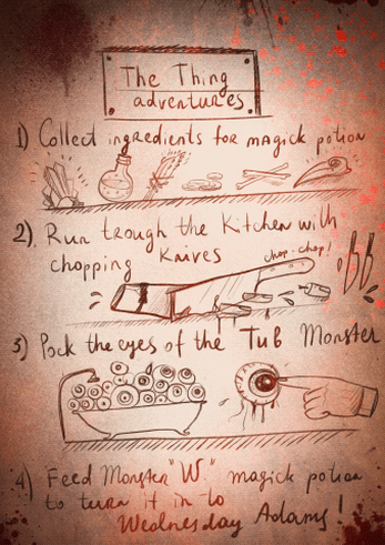 "The Thing", disembodied hand, roaming around the Haunted House. Wednesday Adams is hidden under the secret door, sending you messages in the dreams. “The Thing” is not on your side. It has its own desires and behaviour. You have to bond with it and build the trust, otherwise it wouldn’t collaborate with you. During the mission, slowly you are becoming friends with The Thing, realising there were no Sorcerer causing spell on Wednesday Adams. Wednesday itself is haunting you, dragging in to the darkness of the Haunted House and you are cursed to become a demon with a zombie hand.